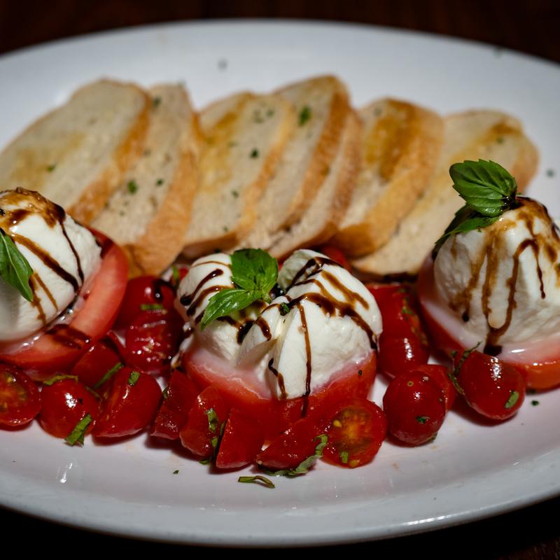 Garlic Crostini, Heirloom Tomato, Red Onion, Balsamic Glaze, Basil, EV Olive Oil, Parmesan Cheese
