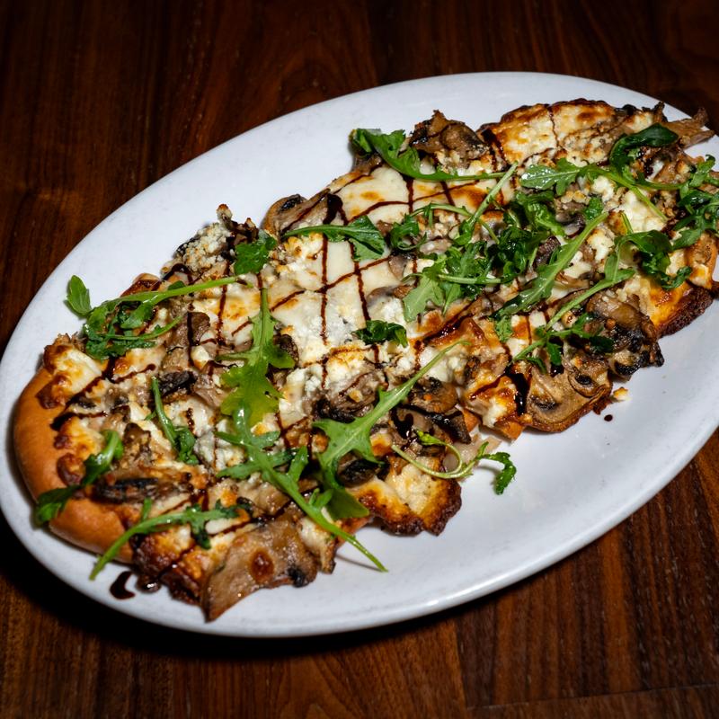 Sauteed mushrooms, arugula, balsamic glaze, goat cheese, olive oil, mozzarella